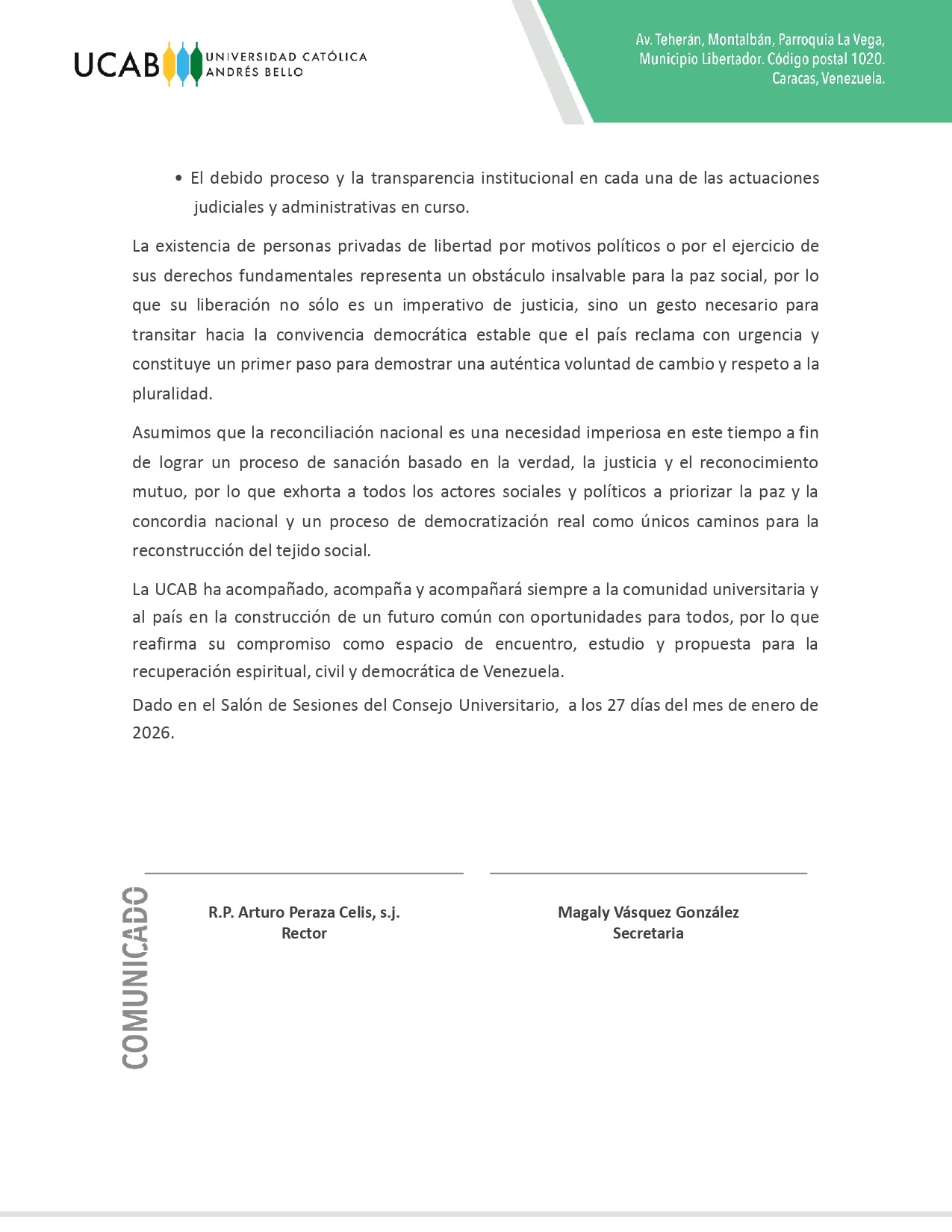 Este martes 27 de enero, el Consejo Universitario (CU) de la Universidad Católica Andrés Bello (UCAB) aprobó e hizo público un comunicado en el que, en ejercicio de sus atribuciones y atendiendo al llamado reciente del papa León XIV a «emprender caminos de justicia y paz», exhortó a las instituciones del Estado “a deponer actitudes de confrontación y a priorizar el bienestar de la persona humana por encima de cualquier interés particular”.