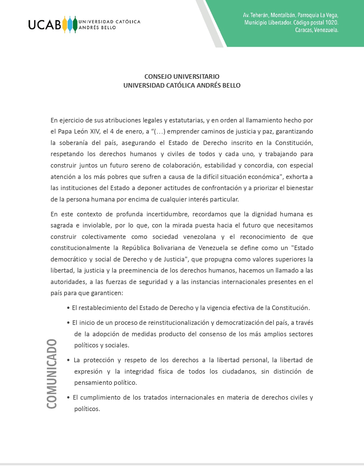Este martes 27 de enero, el Consejo Universitario (CU) de la Universidad Católica Andrés Bello (UCAB) aprobó e hizo público un comunicado en el que, en ejercicio de sus atribuciones y atendiendo al llamado reciente del papa León XIV a «emprender caminos de justicia y paz», exhortó a las instituciones del Estado “a deponer actitudes de confrontación y a priorizar el bienestar de la persona humana por encima de cualquier interés particular”.