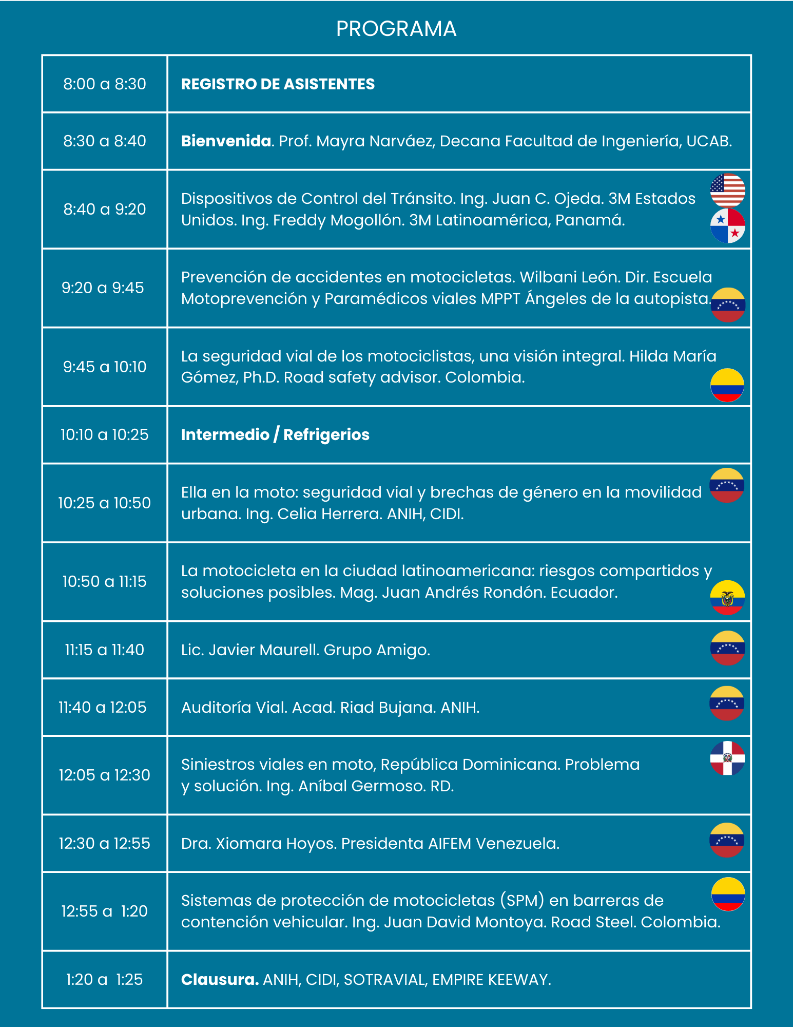 Entre 8 am y 1 pm, los asistentes podrán escuchar las 10 ponencias ofrecidas por especialistas de la UCAB y la UCV, la Academia Nacional de la Ingeniería y el Hábitat y la Sociedad Venezolana de Ingeniería de Transporte y Vialidad, así como de invitados de Panamá, Colombia, Ecuador, República Dominicana y Estados Unidos.
