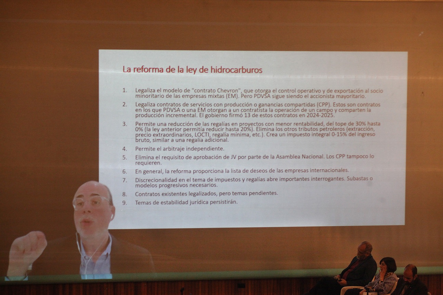 El economista e investigador del Instituto Baker de la Universidad de Rice (Houston, EE. UU.), Francisco Monaldi, junto con la abogada y presidenta de la Asociación Venezolana de los Hidrocarburos (AVH), Cristina Tovar, y el coordinador del Centro Internacional de Energía y Ambiente de Venezuela (CEIA), el ingeniero Oswaldo Felizzola, coincidieron en que los cambios en la legislación pueden ser una oportunidad de apertura para la disminuida industria petrolera nacional, que puede propiciar desarrollo en el sector y generar repuntes en la producción, así como rentabilidad para el Estado y las empresas internacionales que operen en el país.