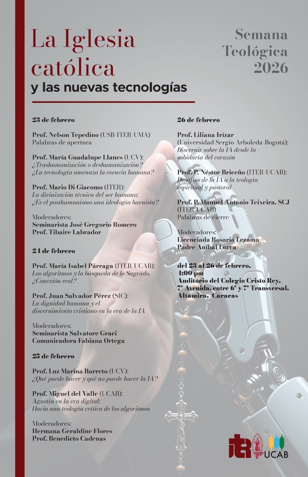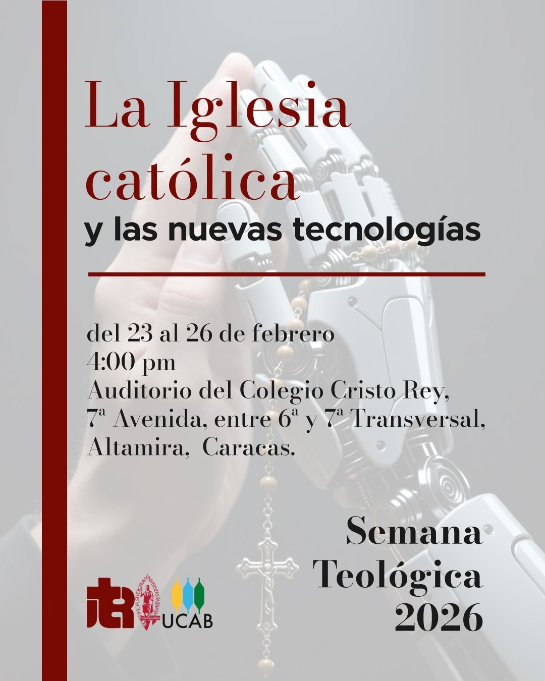 Bajo el título «La Iglesia católica y las nuevas tecnologías», la Facultad de Teología de la UCAB y su Instituto de Teología para Religiosos (ITER) están convocando la Semana Teológica 2026, cuya agenda temática girará en torno al impacto de la inteligencia artificial (IA) en la vida humana, la fe y la acción pastoral.