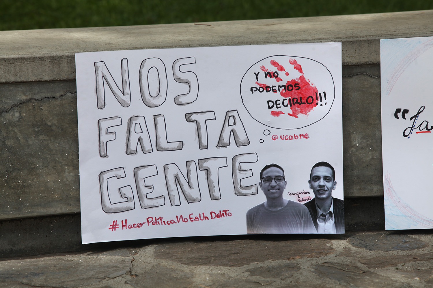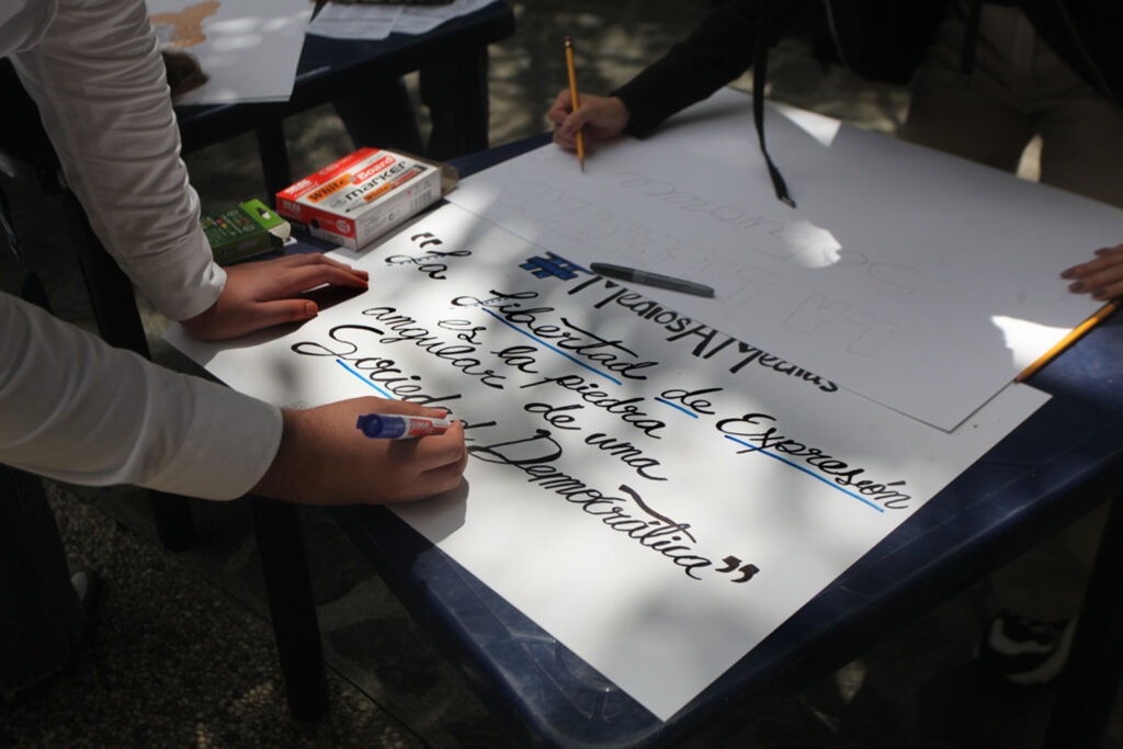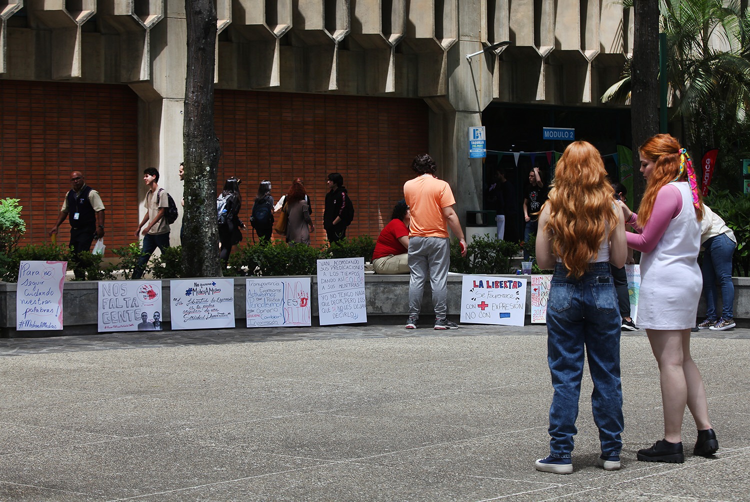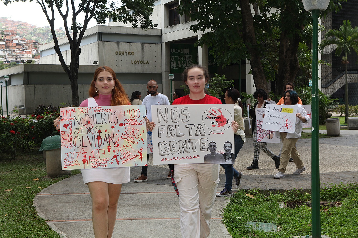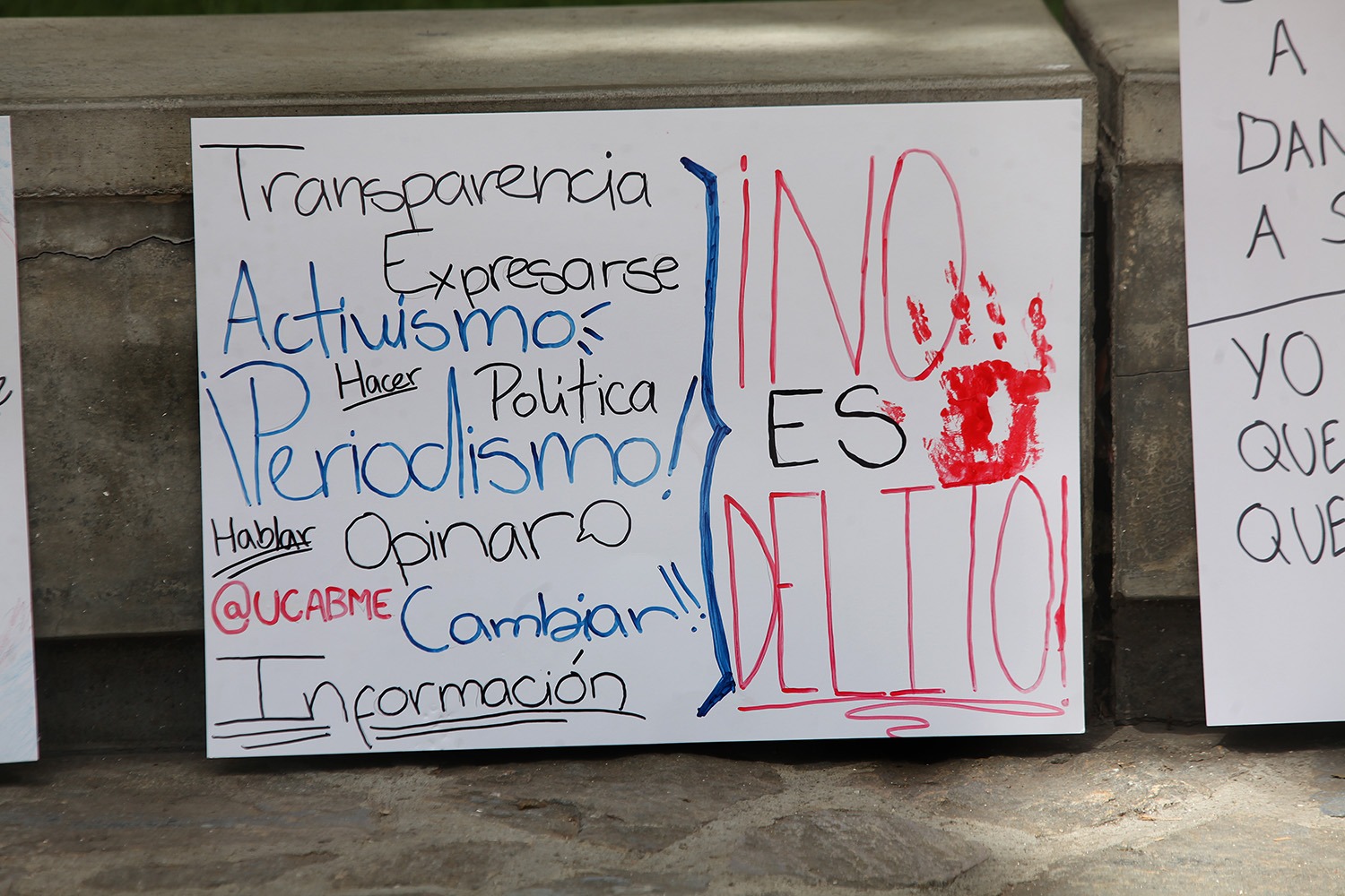 Con mensajes como «La libertad de expresión es la piedra angular de una sociedad democrática», «No es delito expresarse» y «Para no seguir cuidando nuestras palabras», entre otros, los jóvenes ucabistas recorrieron varios espacios del campus Montalbán para sensibilizar a la comunidad ucabista sobre las limitaciones al ejercicio del periodismo y las violaciones a la libertad de expresión e información.