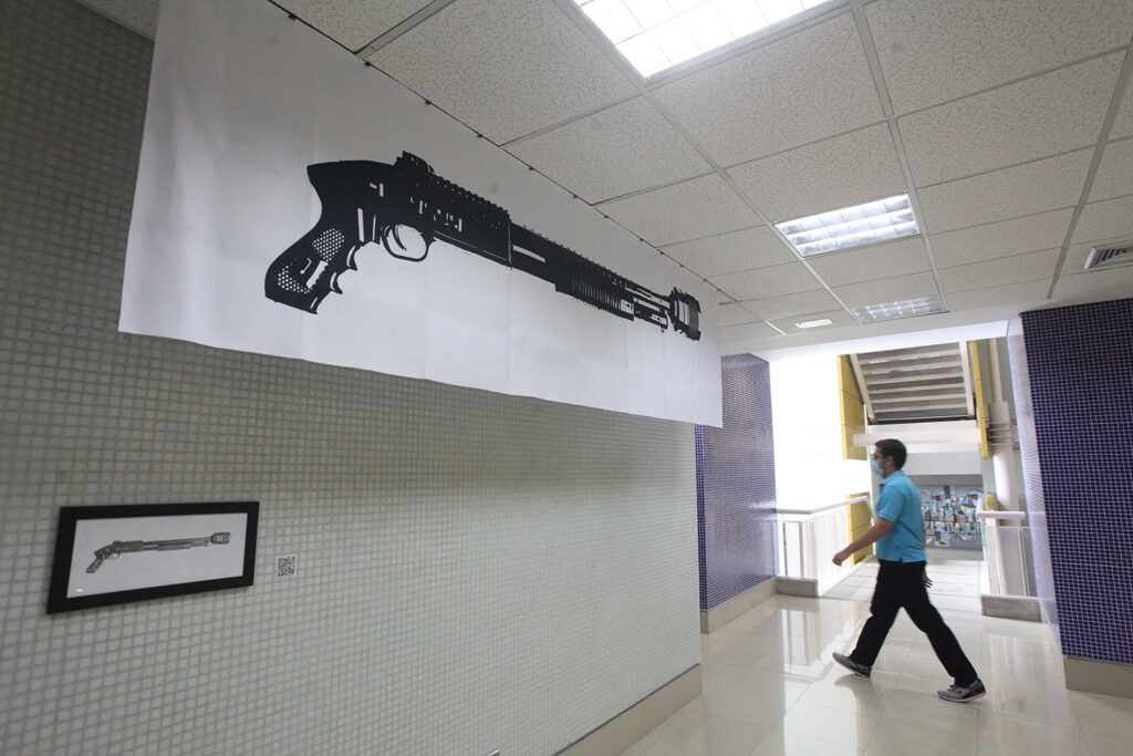 «La obra habla sobre la violencia en redes sociales, sobre la libertad de expresión. Todo está armado en función de eso. Por ejemplo, las esquirlas de las granadas son teclas de teclado de computadora, unos que tienen un significado personal para mí, y a su vez hay un juego de palabra. En la escopeta, si se detalla, en la punta tiene el lente de una cámara; en la parte de recarga están las teclas que forman la palabra Like. Hay un tema orientado a esa violencia en las redes y, sobre todo en estos tiempos donde existe una disposición a la cancelación», dijo el artista.