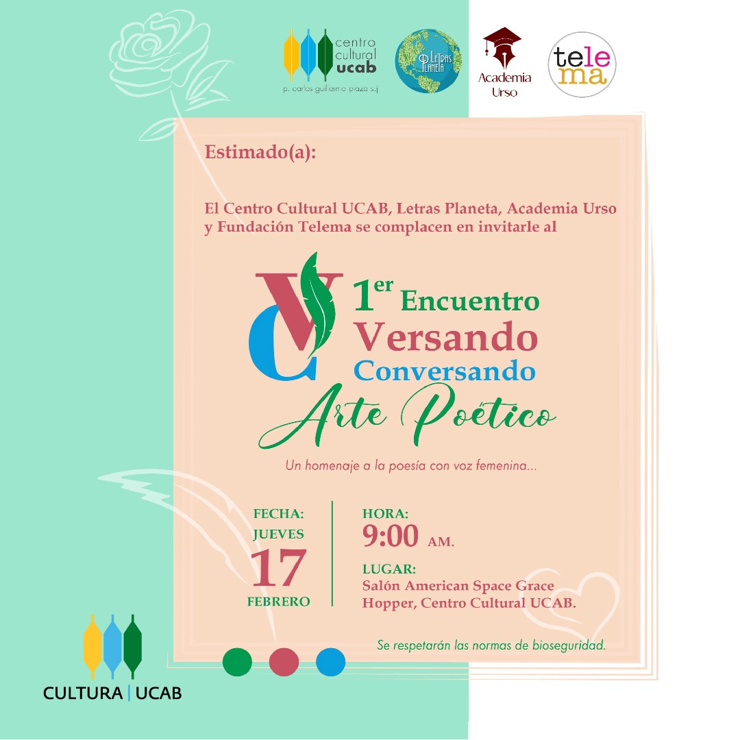El jueves 17 de febrero de 2022, en el marco de las actividades organizadas por el Centro Cultural de la Universidad Católica Andrés Bello (UCAB) para celebrar el amor y la literatura, se estará realizando el Primer Encuentro Versando-Conversando: Arte Poético, un homenaje a la poesía con voz femenina, en la sala American Space Grace Hopper del campus Montalbán, a partir de las 9:00 am.