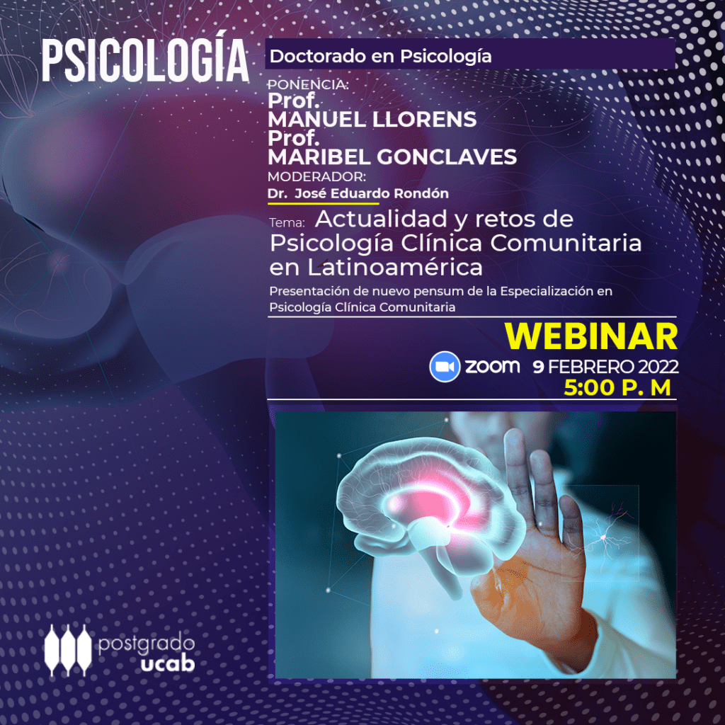 La Dirección de Postgrado de la UCAB, a través de su Doctorado en Psicología, realizará este encuentro virtual en el que dos expertos disertarán sobre los retos de la Psicología Clínica Comunitaria en Latinoamérica.