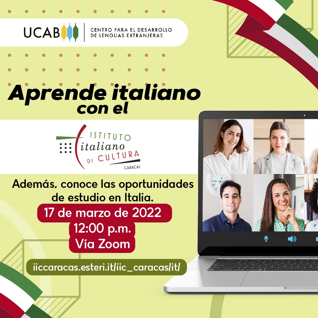Esta actividad virtual, organizada por el Centro para el Desarrollo de Lenguas Extranjeras (CDLE) de la UCAB, permitirá a sus participantes conocer los diferentes cursos y certificaciones que ofrece el Instituto Italiano de Cultura, además de las oportunidades de estudio en Italia.
