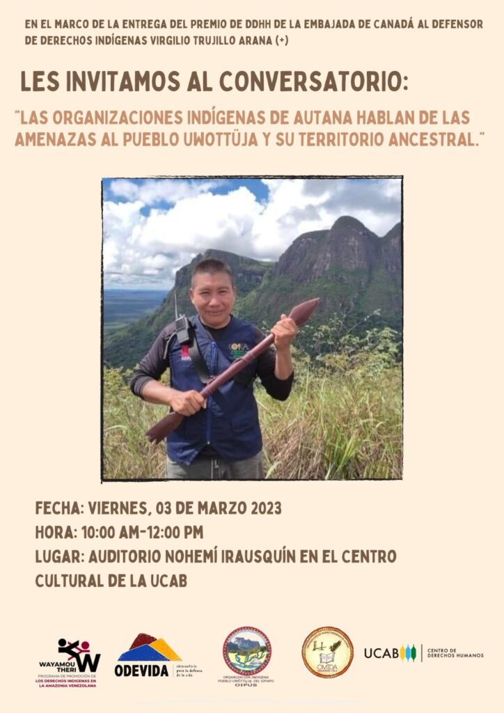 Desde el Centro de Derechos Humanos – UCAB, les invitamos cordialmente al Conversatorio «Las organizaciones indígenas de Autana hablan de las amenazas al pueblo Uwottüja y su territorio ancestral», encuentro realizado en el marco de la entrega del Premio de DDHH de la Embajada de Canadá al defensor de derechos indígenas Virgilio Trujillo Arana (+).