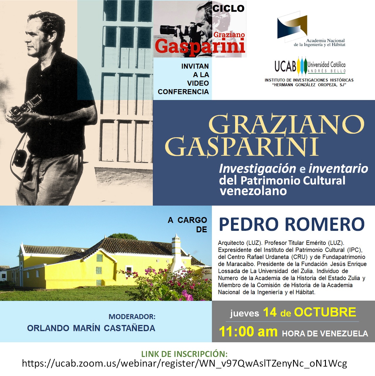El Instituto de Investigaciones Históricas (IIH) de la UCAB y la Academia Nacional de la Ingeniería y el Hábitat, realizarán esa actividad en la que se compartirá la visión general del arquitecto  Graziano Gasparini, sobre el inventario del patrimonio cultural venezolano.
