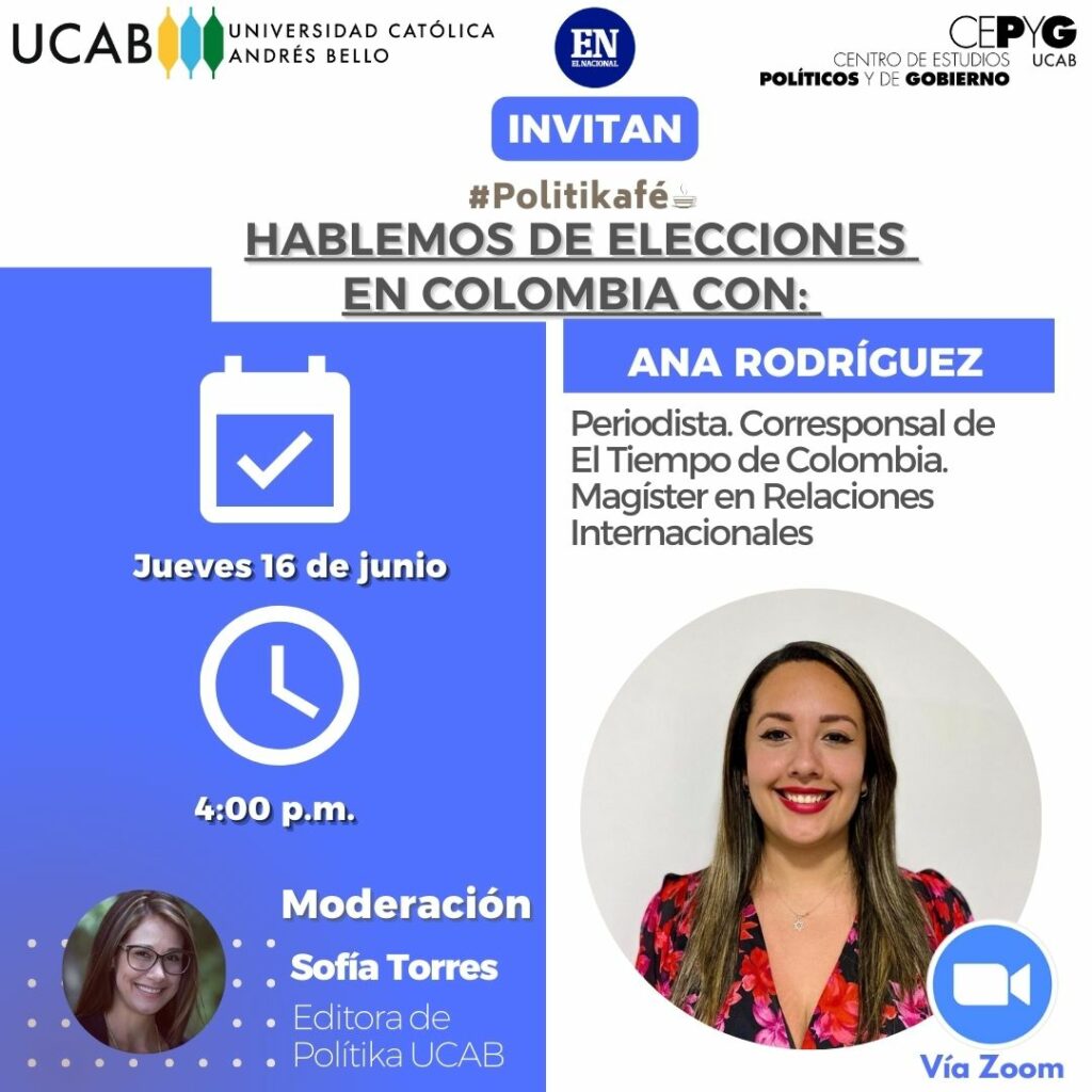 A pocos días de la segunda vuelta de las elecciones presidenciales en Colombia, el Centro de Estudios Políticos y de Gobierno (CEPyG) de la UCAB, el jueves 16 de junio, a las 4:00 de la tarde, a su foro en línea, Politikafé, para analizar el proceso comicial del vecino país, así como sus incidencias, de acuerdo a los posibles resultados, en Venezuela y la región.