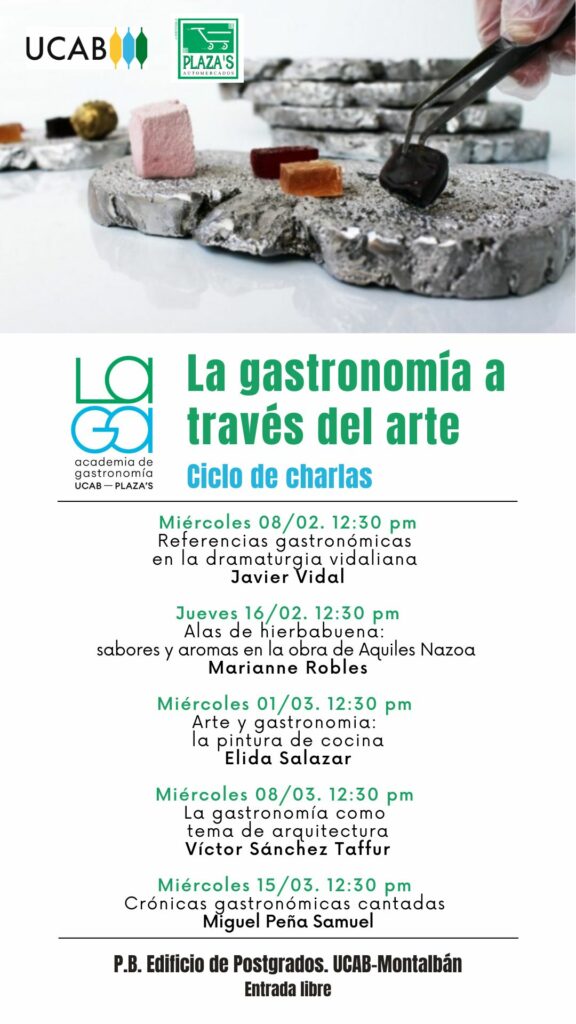 Desde la Academia de Gastronomia UCAB-Plaza’s se extiende la invitación para participar en la tercera charla del ciclo La gastronomía a través del arte que se viene ofreciendo desde el pasado mes de febrero en la sede UCAB-Montalbán en el marco de la Ruta de lanzamiento de la academia.