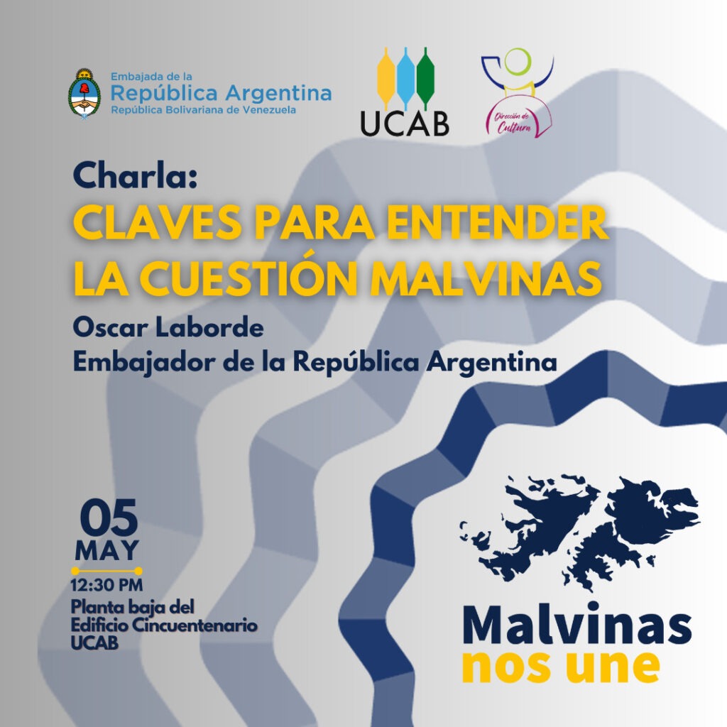 El Secretariado de Internacionalización de la UCAB invita cordialmente a la comunidad ucabista a participar en la charla promovida por la Embajada de Argentina en Venezuela y la Dirección de Cultura de la UCAB: «Claves para entender la cuestión Malvinas».